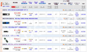 条件は前述のとおり、容量2TB最優先、馬鹿高くない、その中でより性能の良いもの。看板倒れを掴みたくもない。先日交換したMBにM.2スロットもあるのでNVMeを対象とし、遅いSATAは除外。
