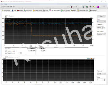 HD Tuneの挙動の怪しさがあったので、txbenchでも30GBファイルのシーケンシャルライトテストを行い、同様に25GBでの速度低下を確認している。(グラフ表示がいまいちだったので、キャプチャを残していない。)